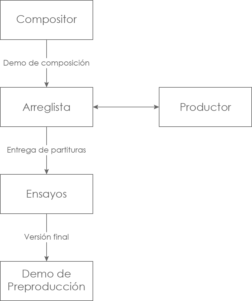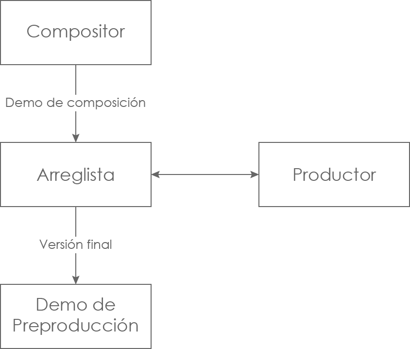 • En la composición básica, el arreglista recibe un demo de composición junto con las instrucciones del productor. El arreglista hace su trabajo, normalmente presentando una maqueta de arreglo y recibe posteriormente los comentarios del productor.