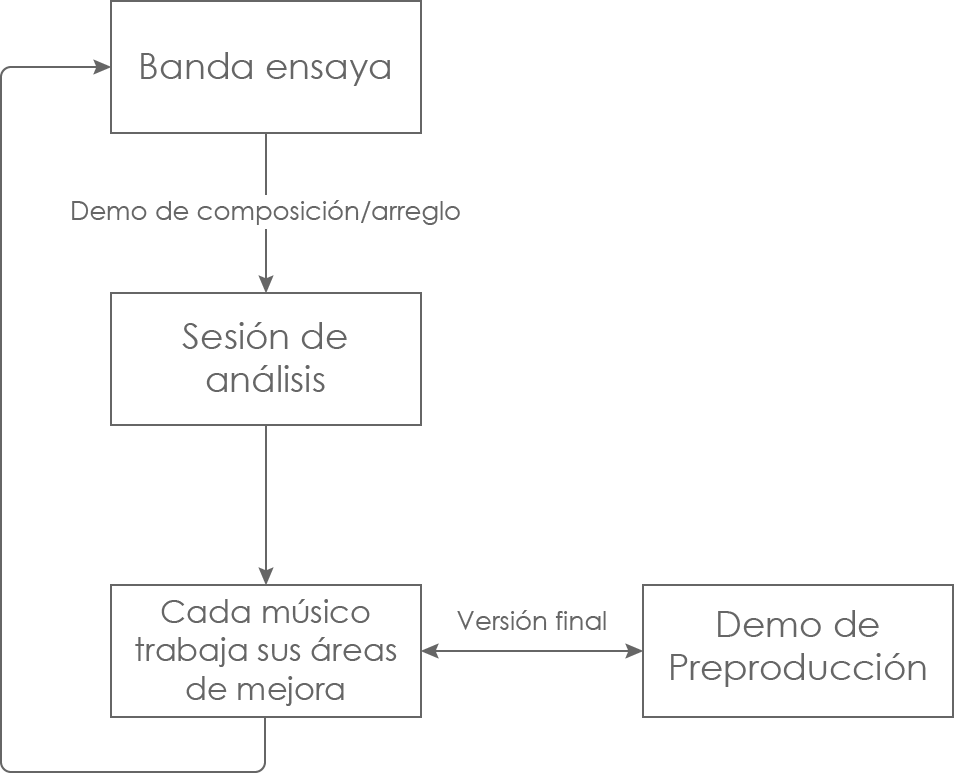 • Por otro lado, cuando se realiza composición colectiva, la banda realiza ensayos compositivos, cuyo resultado es en esencia, una maqueta de arreglo instrumental. Esta maqueta se graba, y se puede llamar demo de composición o demo de arreglo instrumental. El productor escucha este demo con la banda para encontrar oportunidades de mejora. Posteriormente, cada integrante de la banda trabaja por su cuenta en dichas áreas, para presentarse al siguiente ensayo. Este proceso se repite hasta obtener la versión final del arreglo instrumental, cuya grabación constituye el demo de preproducción (figura 2.6.).