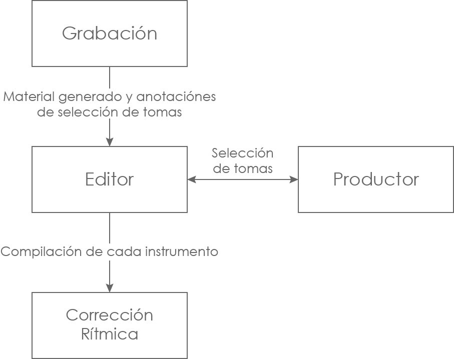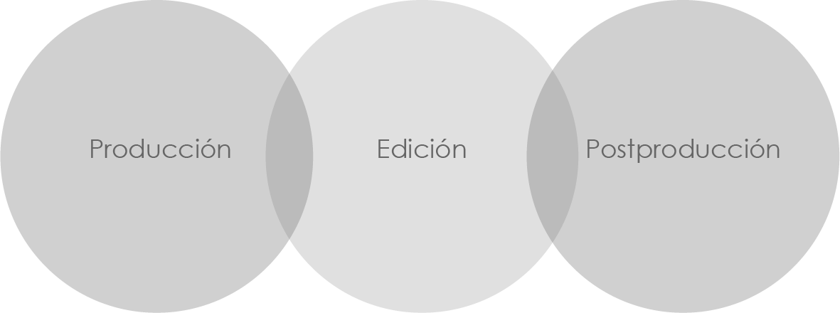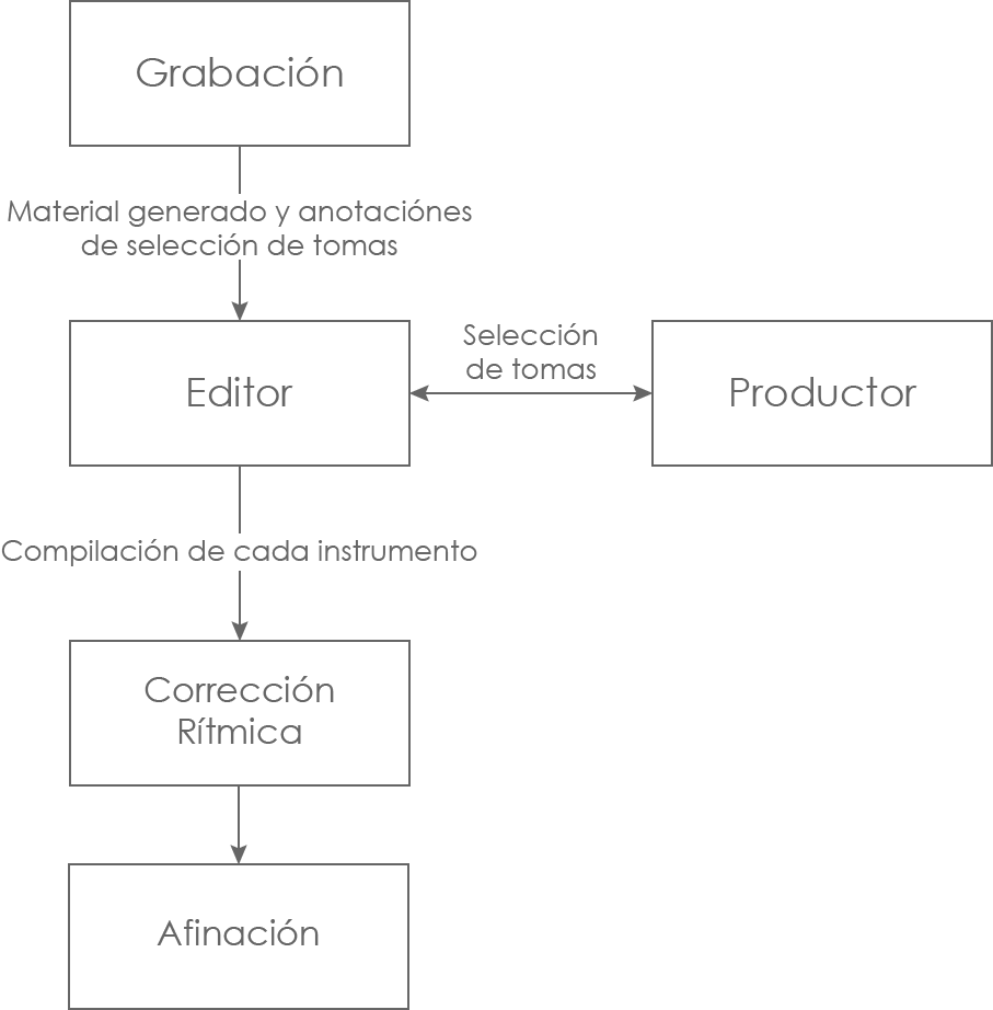 Al igual que durante el arreglo instrumental, la edición es una etapa intermedia entre dos procesos: la producción y la postproducción.Figura. Etapa de edición.