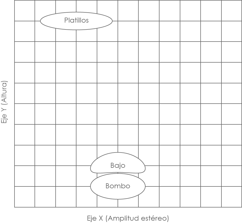 • El eje X consiste en la ubicación de los instrumentos a la izquierda o derecha, en la mezcla. En los ejemplos anteriores, podríamos ubicar los platillos ligeramente a la izquierda, lo cual colaboraría a definir aún más el sonido de estos (figura 2.11.). En la gráfica, se muestran los ejes X y Y. La ubicación de los platillos es distinta que las del bajo y bombo, tanto en el eje X como en el Y.