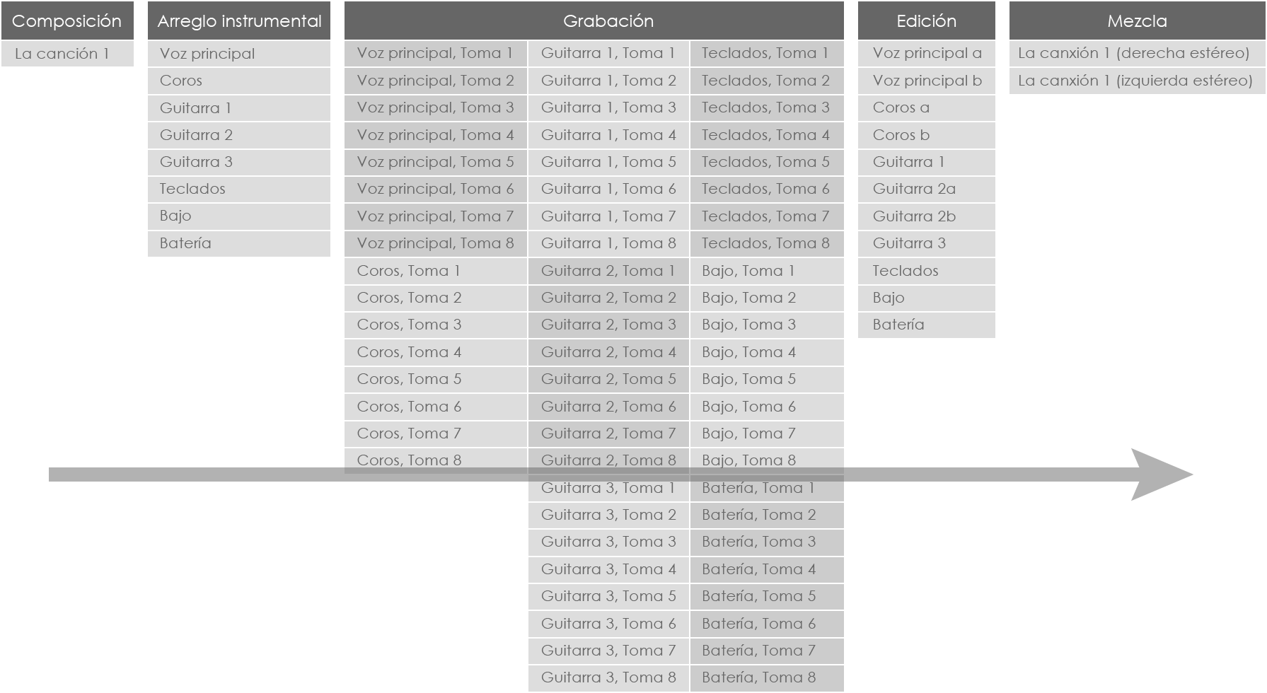 • Posteriormente, durante la grabación se generan varias tomas para cada instrumento, acumulando suficiente material para iniciar el proceso de compilación de la postproducción.