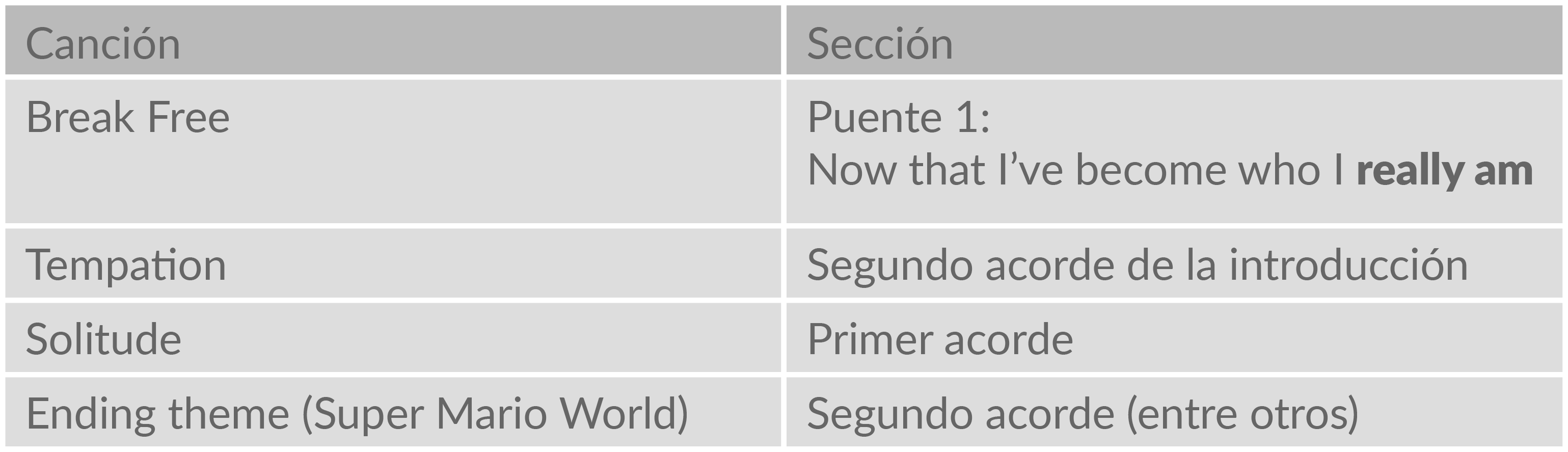 Al igual que los acordes disminuidos, los aumentados son muy tensos y como tales, se pueden utilizar para generar impacto emocional en una secuencia de acordes. A continuación varios ejemplos de su aplicación (Figura 16.5.).• Comencemos con una canción muy popular. Break Free de Ariana Grande y Zedd. En el puente, el acorde aumentado es el último antes de iniciar el coro.