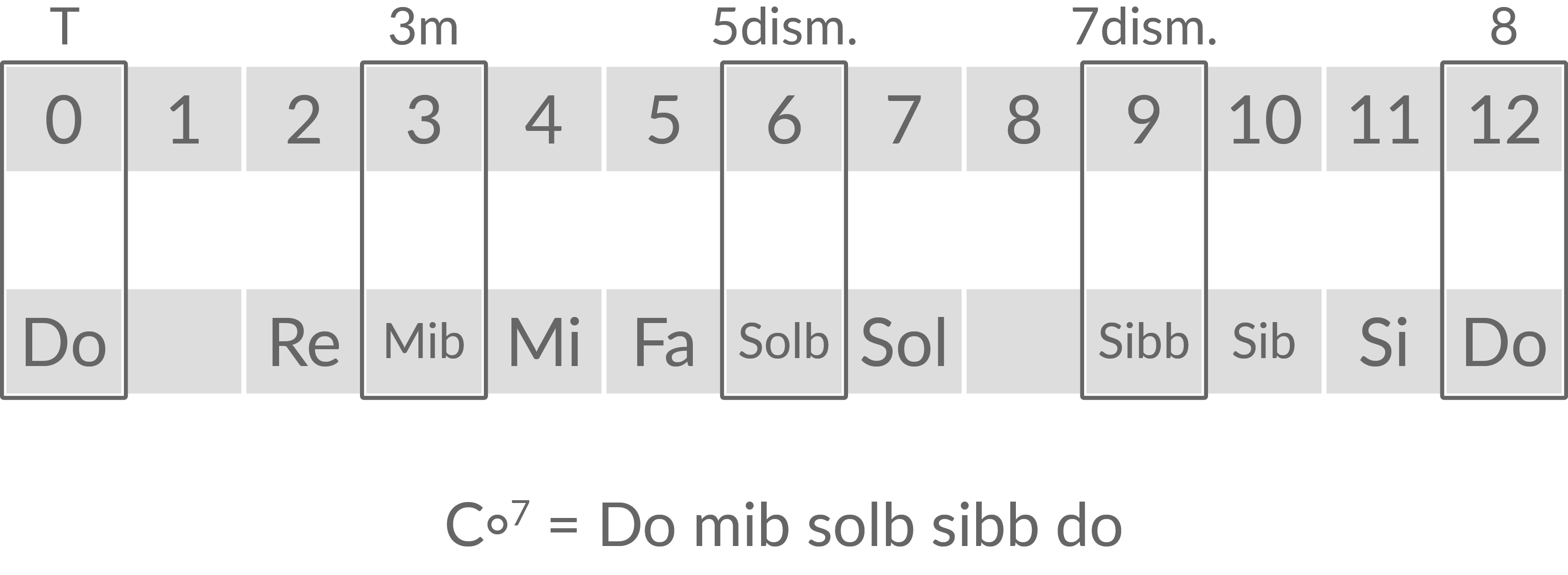 Figura 16.7. Acorde disminuido: División de la octava en cuatro partes