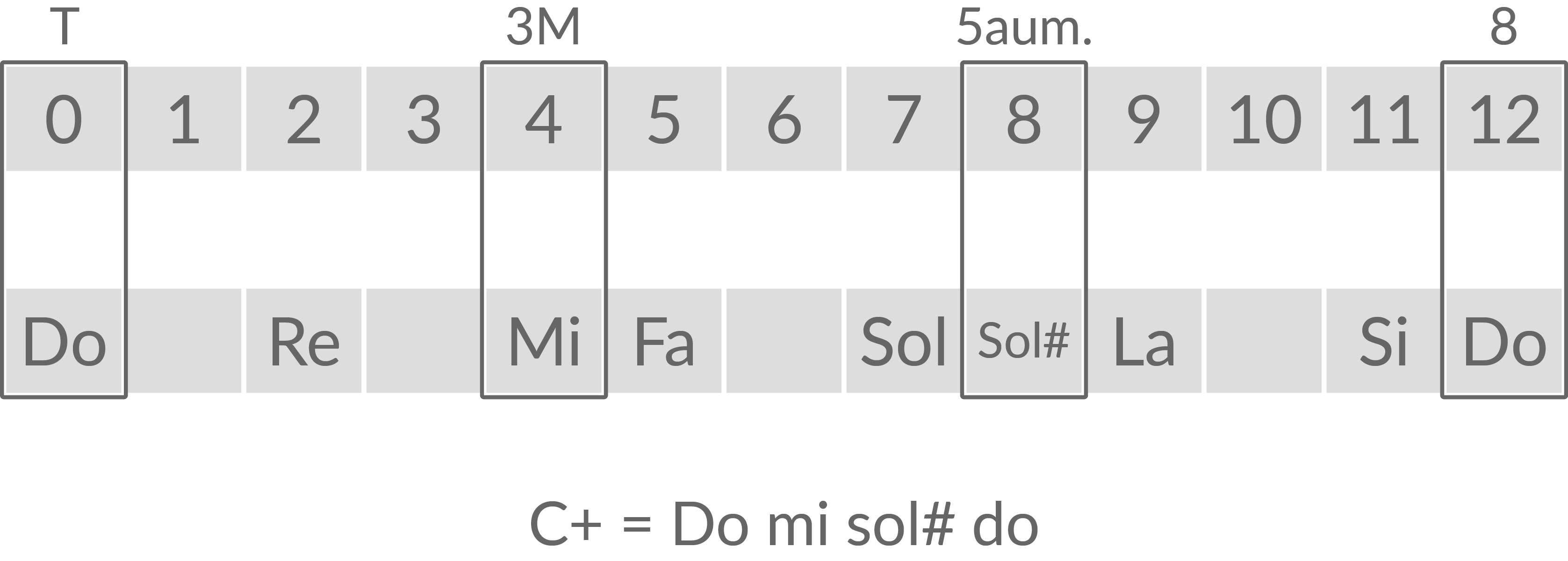 • Veamos ahora el acorde aumentado. Se construye con los intervalos ubicados en los semitonos 0, 4, 8 y 12. Estos son: tónica, tercera mayor, quinta aumentada y octava (Figura 16.8.). En el caso del acorde Do aumentado, estos intervalos corresponden a las notas Do, Mi, Sol sostenido y Do.