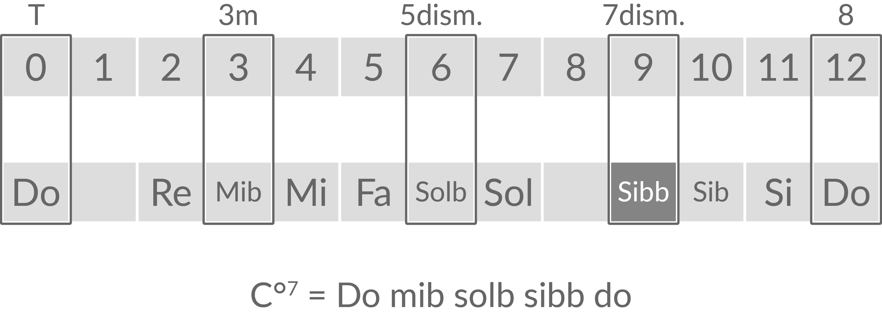 • En el caso del acorde disminuido con séptima, se construye con los intervalos ubicados en los semitonos 0, 3, 6, 9 y 12. Estos son: tónica, tercera menor, quinta disminuida, séptima disminuida y octava (Figura 16.7.). En el ejemplo obtenemos Do disminuido séptima, el cual tiene las notas Do, Mi bemol, Sol bemol, Si doble bemol y Do.